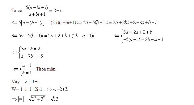 Câu 9.b (1,0 điểm). Cho số phức [tex]z[/tex] thỏa mãn [tex]\frac{5(\overline{z}+i)}{z+1}=2-i[/tex]. Tính mô-đun của số phức [tex]w=1+z+z^2[/tex].