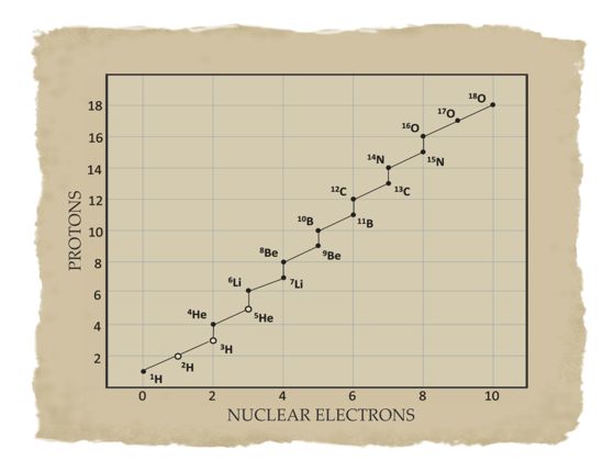 Hình 1. Một bản sao lại của biểu đồ năm 1931 của những đồng vị nguyên tố nhẹ đã truyền cảm hứng cho Harold Urey tìm kiếm deuterium. Những vòng tròn tô đen biểu diễn các đồng vị đã biết. Những vòng tròn rỗng biểu diễn các đồng vị Urey muốn tìm. Hạt nhân được cho là gồm toàn bộ proton, xác định số khối của nó, và đủ số “electron hạt nhân” để khớp với điện tích toàn phần của nó. Như vậy, trục tung thật ra biểu diễn số khối A, và trục hoành biểu diễn A trừ đi số nguyên tử tối thiểu Z, tức là số neutron.