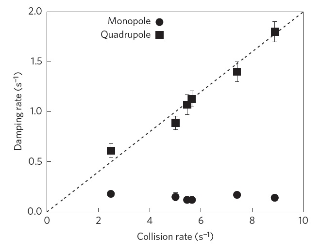 Trong mode đơn cực, chất khí chịu sự tắt dần rất ít, nghĩa là nó vẫn ở trạng thái phi cân bằng lâu dài. Một chất khí tiêu biểu (ở mode tứ cực) chịu sự tắt dần với tốc độ tăng theo tốc độ va chạm của các phân tử khí, cho biết entropy đang tăng và chất khí đang tiến tới cân bằng nhiệt. Ảnh: Lobser, et al. ©2015 Macmillan Publishers Limited